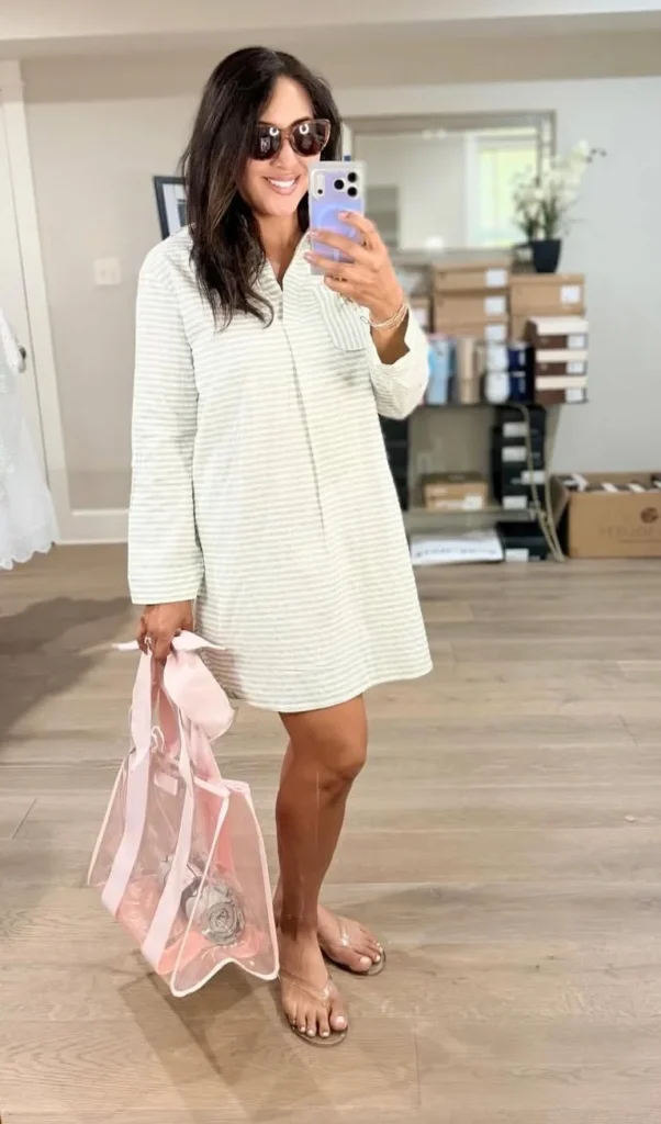 Choose one in a breathable cotton or linen blend. Keep everything else simple. White sandals. Simple jewelry. A natural straw bag.