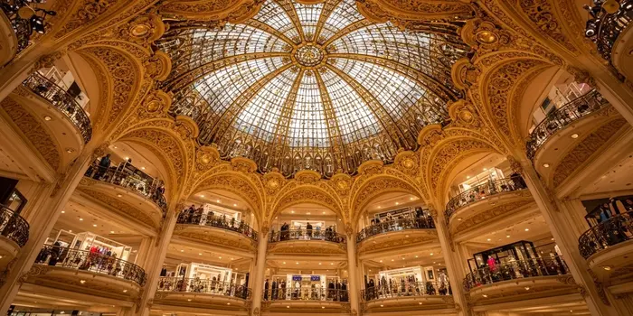 The magnificent Art Nouveau dome of Galeries Lafayette, a temple of fashion and architecture in Paris.