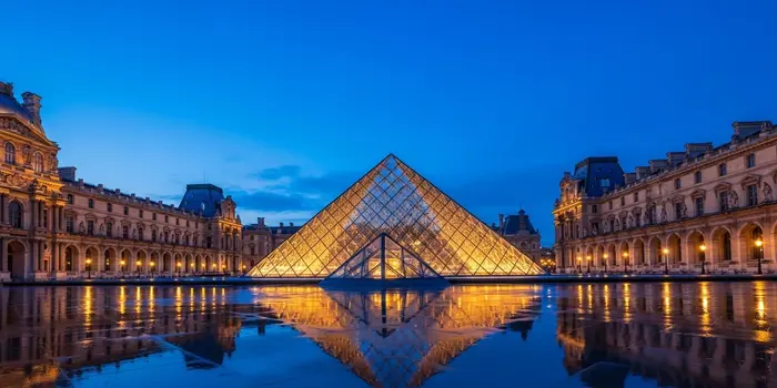 The glowing glass pyramid of the Louvre Museum, where modern architecture meets centuries of French history.