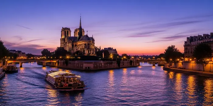 A romantic evening boat cruise on the Seine, passing by the historic landmarks of central Paris.
