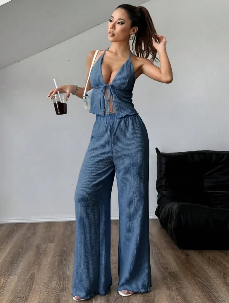 Top and trousers in the same linen fabric. The same color. Everything already decided for you before you even open your wardrobe.