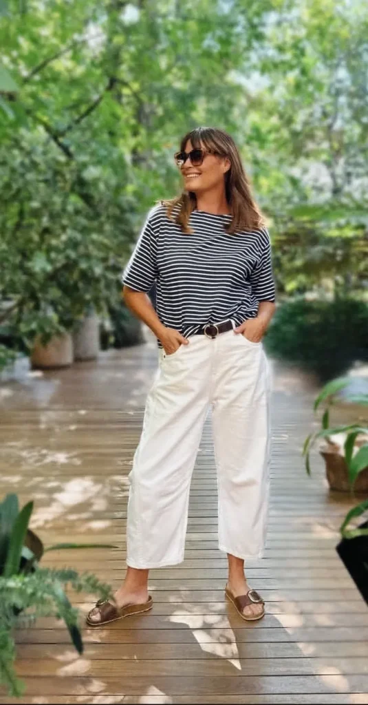 A navy and white Breton stripe marinière tucked into straight-leg white jeans. Ballet flats. A small leather crossbody bag. A thin gold necklace.