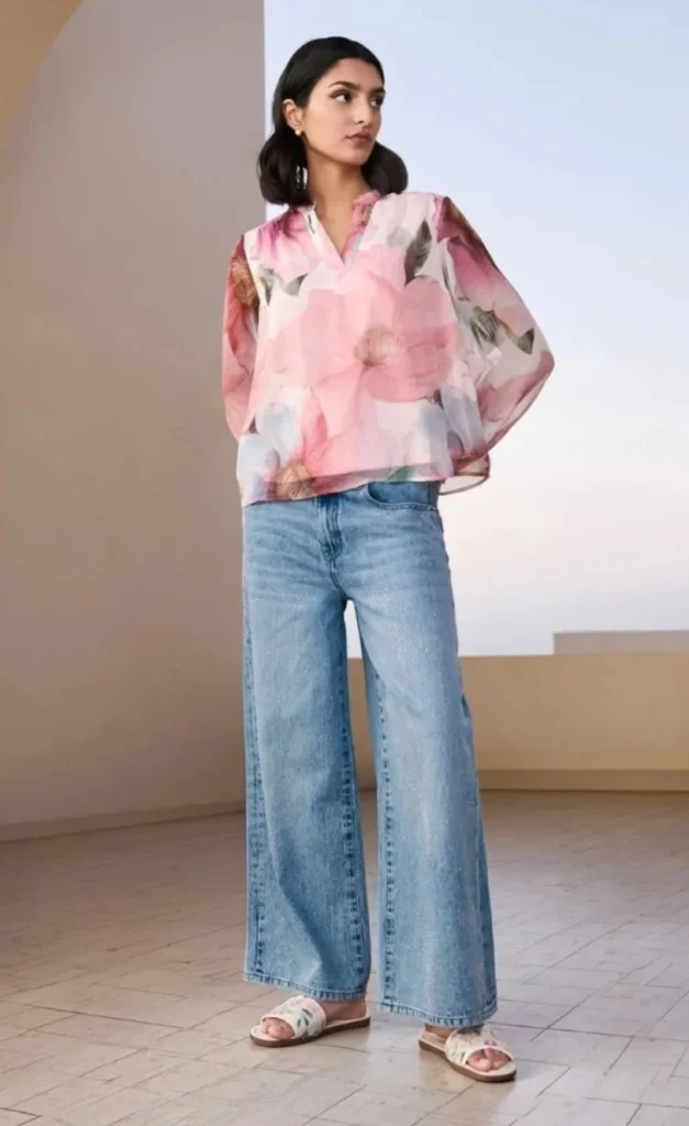 Choose a blouse in dusty, muted florals — not bright, not bold, just soft and a little faded-looking. Tuck it loosely into jeans. Add ballet flats or white sneakers.