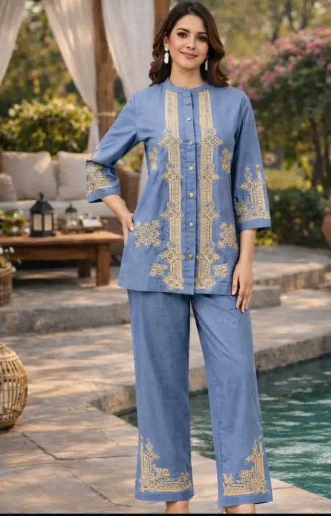 Choose a co-ord in warm sand, soft sage, or dusty ecru. Add leather sandals and a single gold necklace. A structured tote.