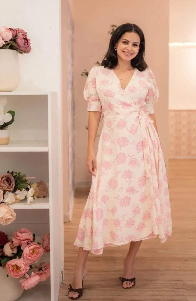 A wrap dress in a muted, vintage-inspired print is the most effortlessly French thing you can wear in Paris.
