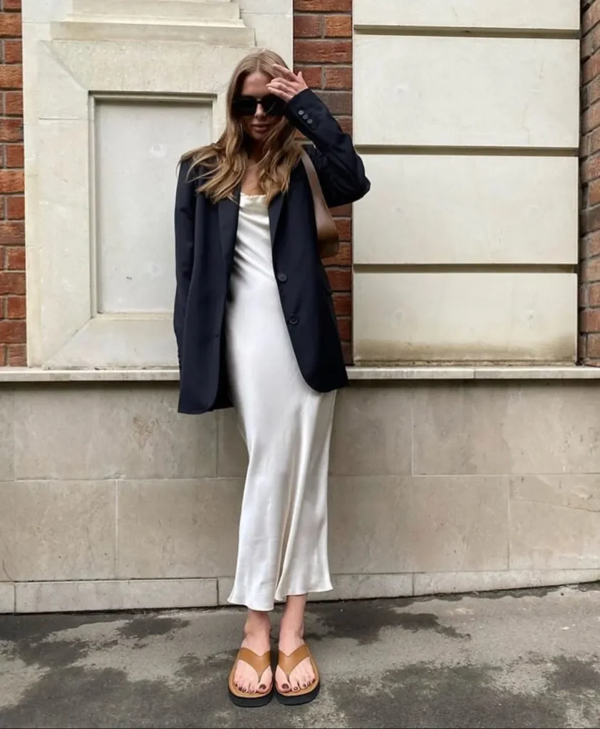 Choose a blazer in soft camel or warm grey. Pair it with a bias-cut slip skirt in ivory or champagne. Add leather loafers and pearl earrings.