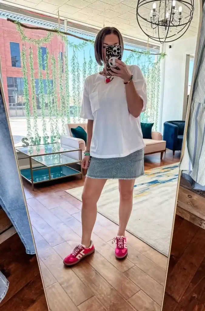 Choose a skirt in navy and white or black and cream thin stripes. Tuck the tee in neatly. Add ballet flats and a small crossbody.