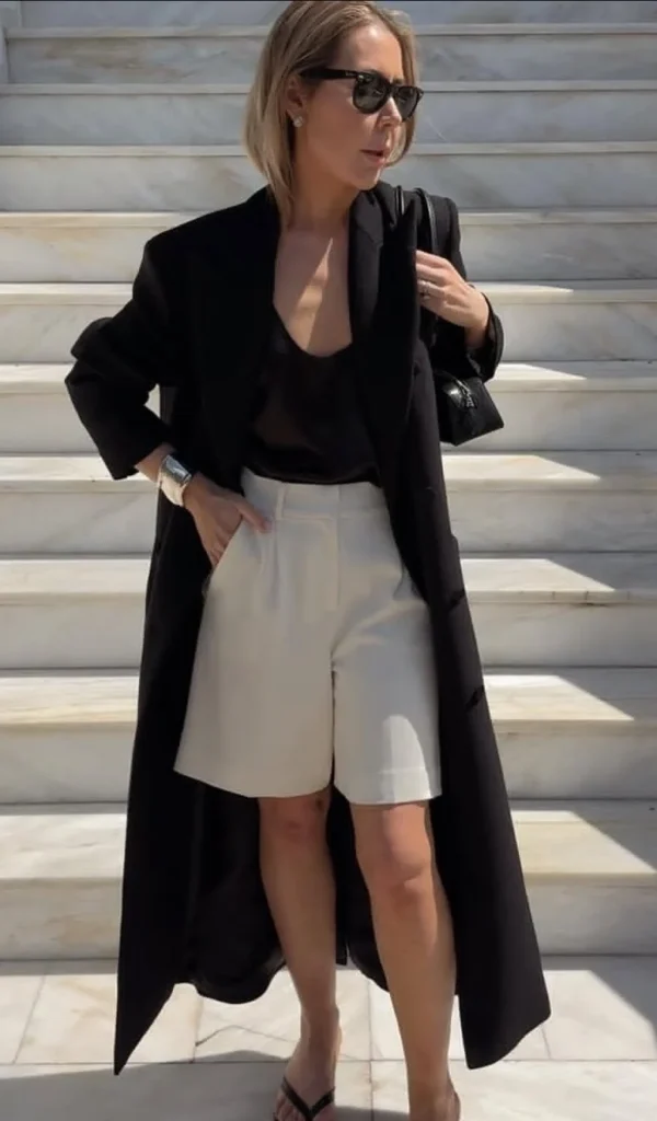Choose shorts in warm beige, soft ivory, or classic navy. Wear them with a relaxed linen blazer in a complementary tone. A simple white tee underneath. Leather loafers or clean white sneakers.