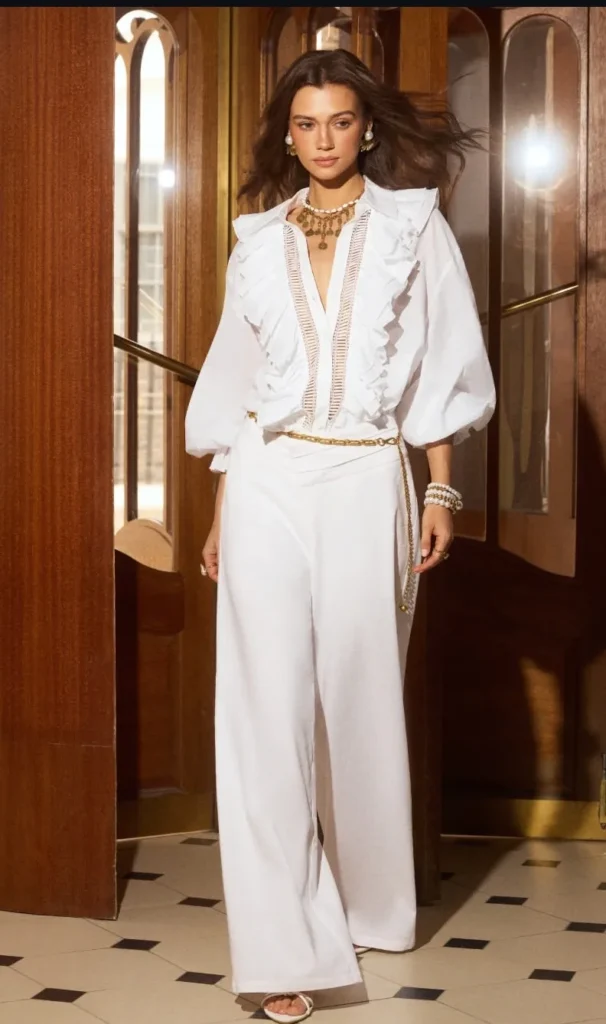A crisp white blouse tucked into high-waist tailored trousers is the foundation of Parisian dressing.