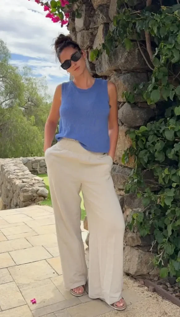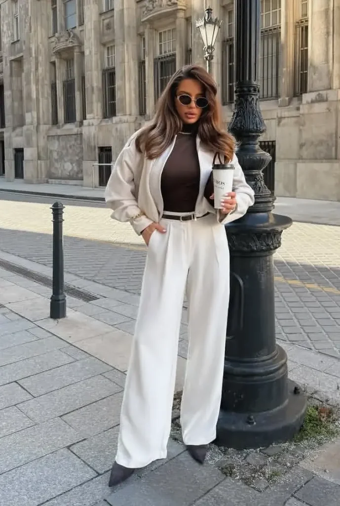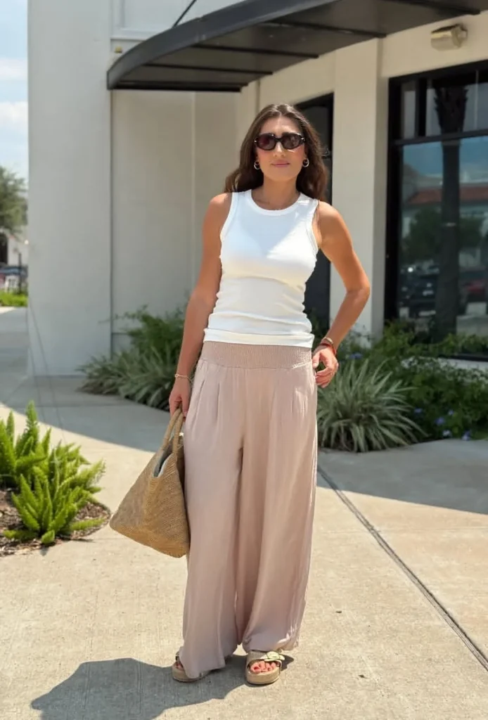 A clean white fitted tee tucked into wide-leg linen trousers in cream, ivory, or soft beige. Leather loafers. A structured tote. One thin gold bracelet.