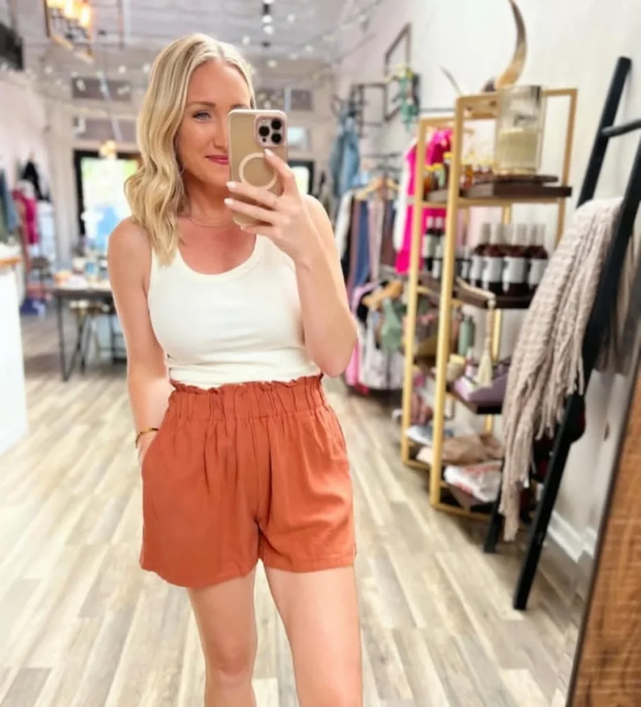 Tailored linen shorts in warm beige or soft white paired with a fitted ribbed knit tank in ivory or sage. Add leather flat sandals and a small basket bag.