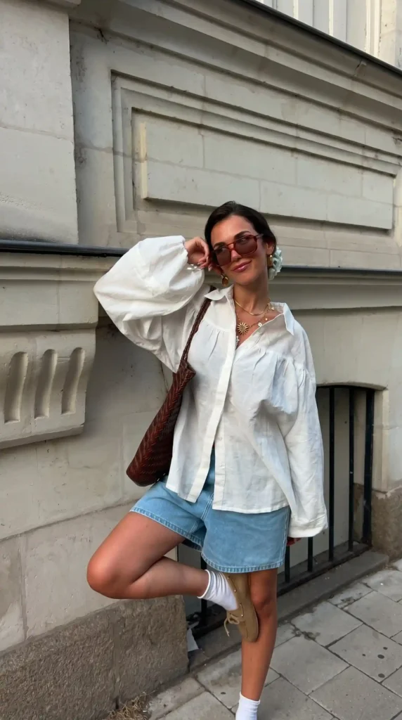 A pair of well-fitted denim shorts in a classic mid-wash or white. A loose linen shirt worn open over a simple white tee or tied at the waist.