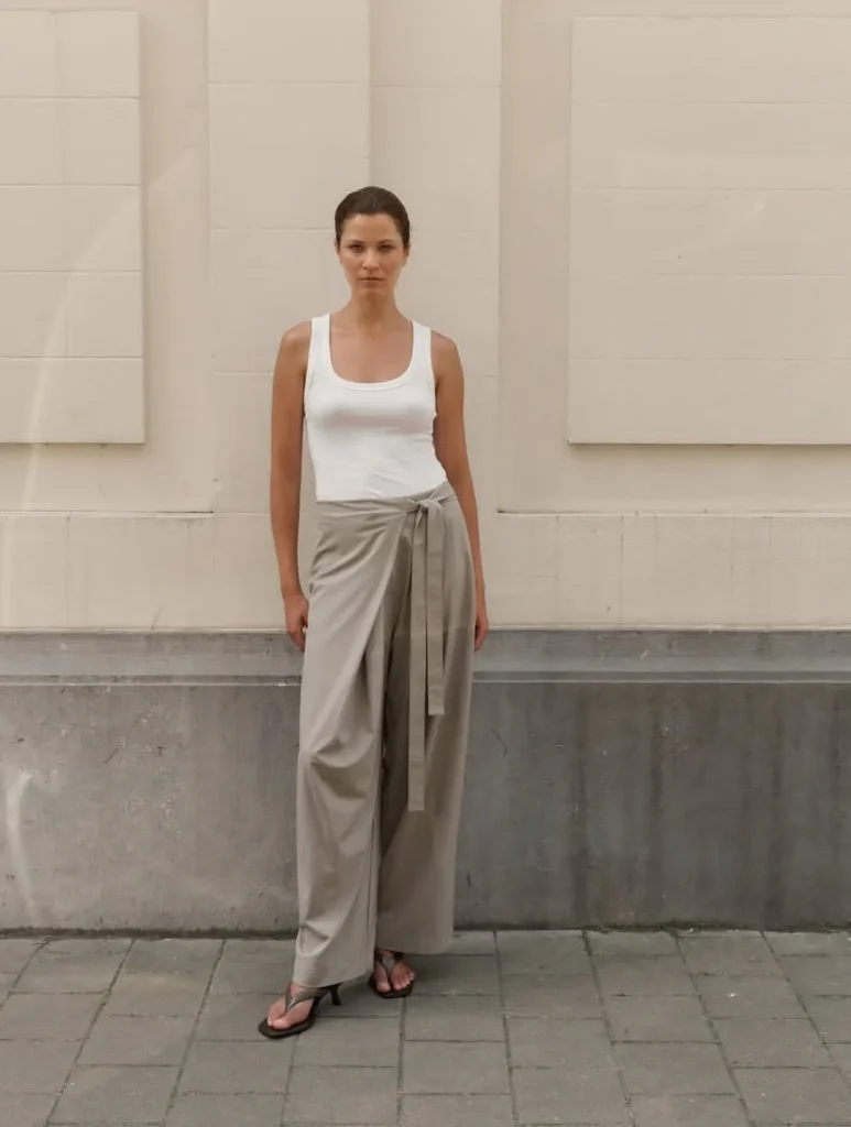 Pair a wrap top in ivory, blush, or warm yellow with wide-leg flowy trousers in a complementary tone. Add wedge sandals and a structured tote.